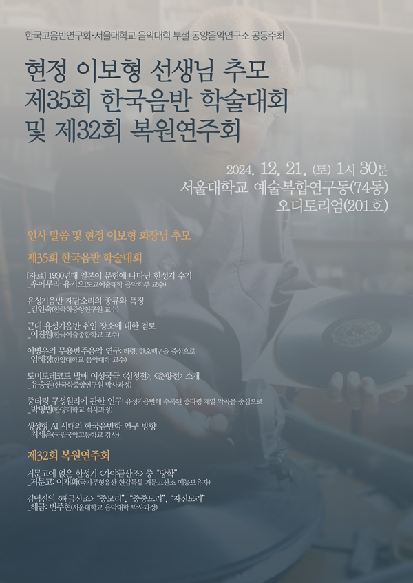 ÇöÁ¤ À̺¸Çü ¼±»ý´Ô Ã߸ð Á¦35ȸ Çѱ¹À½¹ÝÇмú´ëȸ ¹× Á¦32ȸ º¹¿ø¿¬ÁÖȸ(ÁÖÃÖ:Çѱ¹°íÀ½¹Ý¿¬±¸È¸¡¤¼¿ï´ëÇб³ À½¾Ç´ëÇÐ ºÎ¼³ µ¿¾çÀ½¾Ç¿¬±¸¼Ò) ÇöÀå ³¶µ¶